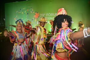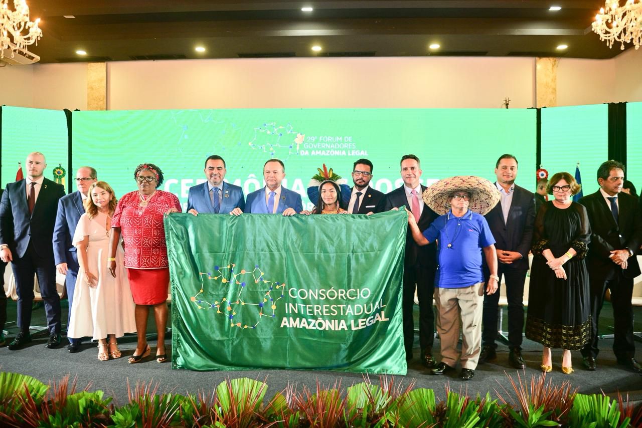 Representantes de povos originários do Maranhão, quilombolas e ribeirinhos conduzem a bandeira do Consórcio da Amazônia durante solenidade em São Luís. Foto: Diego Gurgel/SecomCom participação ativa nas reuniões do Consórcio de Governadores da Amazônia Legal desde a sua criação, em 2019, Gladson Camelí destacou a importância do bloco para o fortalecimento das políticas ambientais de forma coordenada na captação de recursos e sua luta no fomento de legislações que reconheçam o “custo amazônico” como prioridade. “O Acre segue sendo protagonista da pauta ambiental na Amazônia”, afirmou.